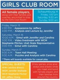 Elementary Chess Championships (Nashville, May 10-13) with special guests WIM Carolina Blanco, WGM Katerina Nemcova and WGM Jennifer Shahade.March 2019: Girls Club Room at the K-9 Chess Championships in Schaumburg, Illinois. Read a recap from Women Program Director Jennifer Shahade here.