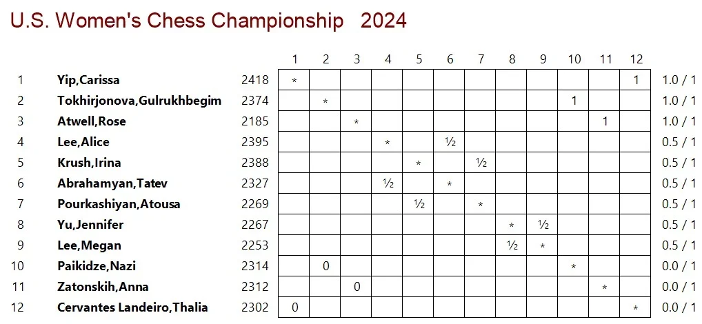 Things picked up right where 2023 left off in the 2024 U.S. Women’s Championship, with IMs Gulrukhbegim “Begim” Tokhirjonova and Carissa Yip each winning their first-round games. As a reminder, Yip and Tokhirjonova each won seven of their 11 games last year, with Yip finishing a half-point ahead after a rollercoaster finish.