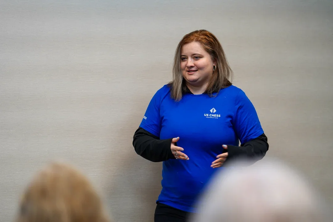 Speaking toward the end of the opening ceremony were Anna Wyzywany and David Cogswell of Power Chess, a chess-based program for children and adults that offers tournaments, classes, and events in Utah. Wyzywany mentioned that she looks up to the players in the U.S. Senior Women’s Championship. Likewise, FM Rose Atwell, a frequent participant in the U.S. Girls’ Junior Championship, made an X post before Friday’s Round 1, wishing to meet and to play alongside the senior women.