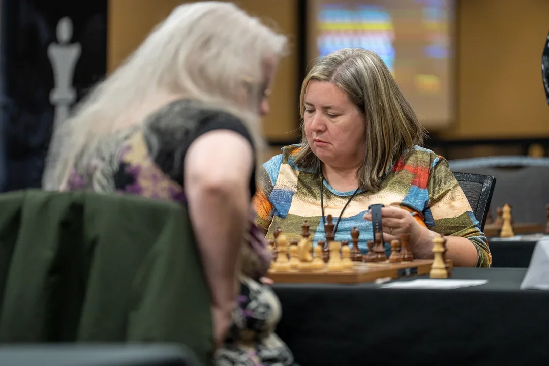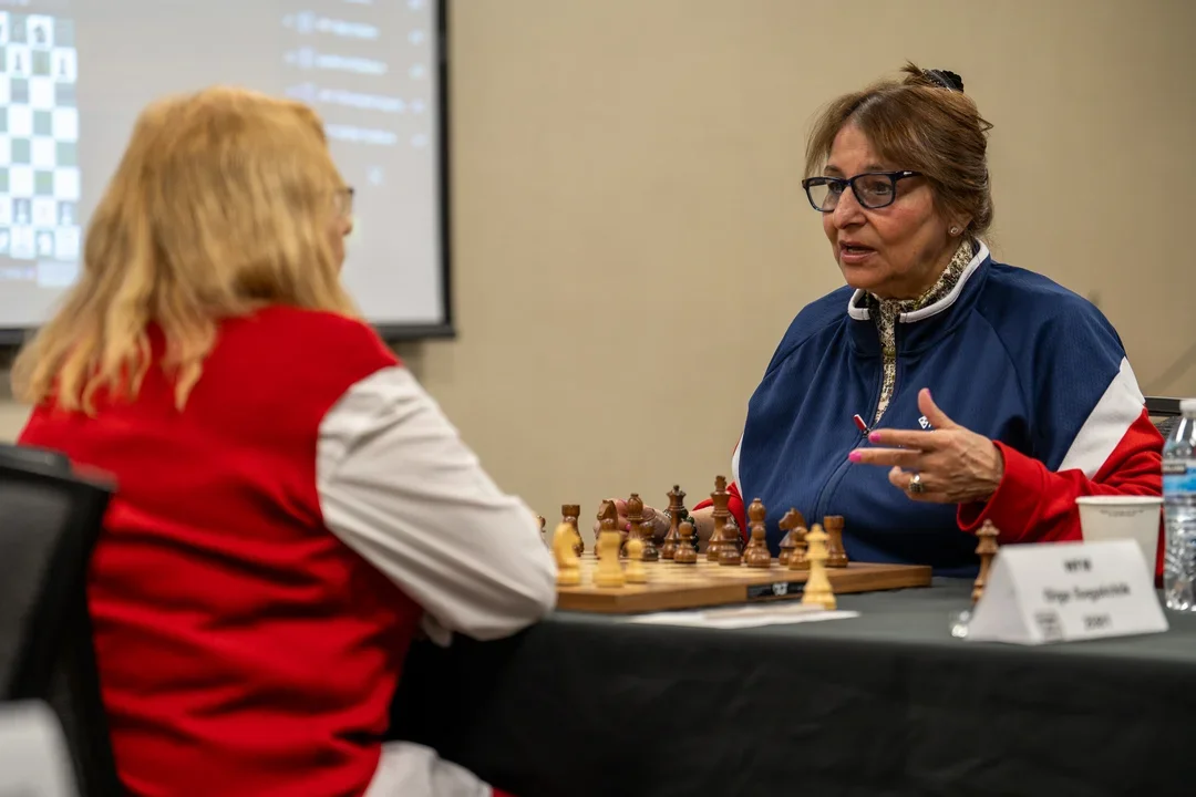 The only player new to Guadalupe was Varinia Cabrera. On Board 1 in Round 1, WGM Anjelina Belakovskaia played Cabrera for the first time since their topsy-turvy last-round encounter in the inaugural 2023 U.S. Senior Women’s Championship. That game secured the 2023 title for Belakovskaia. As she did in their previous game, Belakovskaia prevailed over Cabrera.