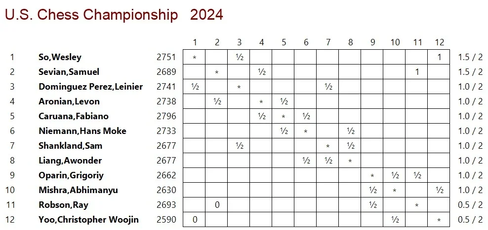 Today’s remaining matchups are: Robson – Caruana, Niemann – Dominguez, Yoo – Oparin, and Aronian – Liang. Games can be followed live here.