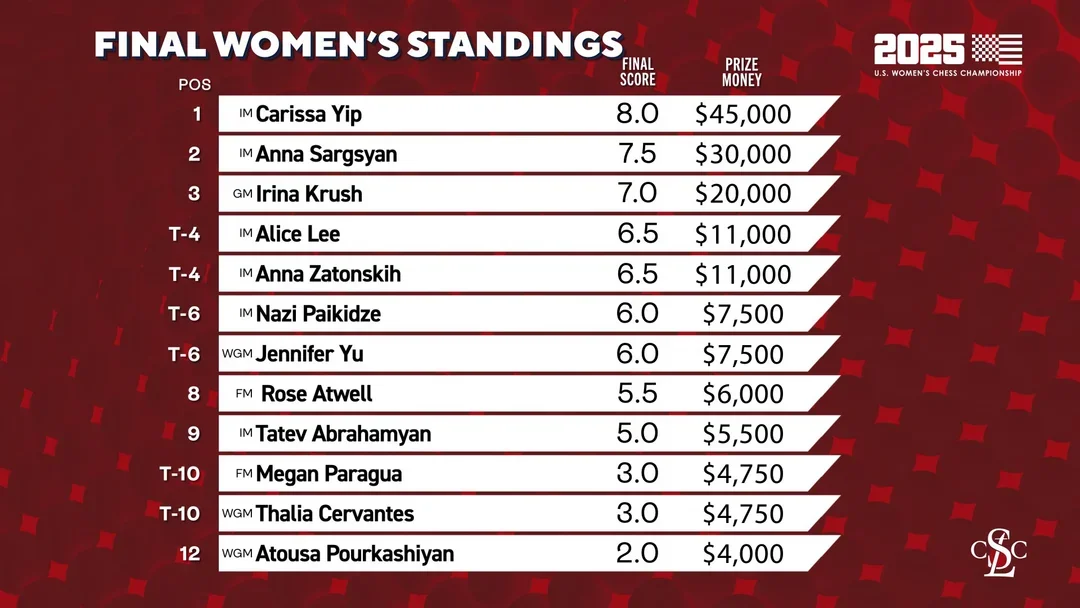 Caruana and Yip won $62,000 and $40,000 respectively, with Yip also taking home the $5,000 Finish Strong bonus prize for her 5½/6 score over the final six rounds.