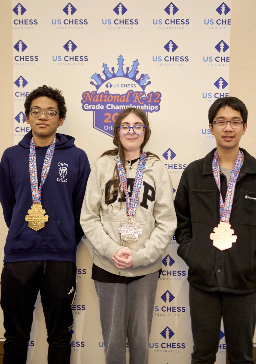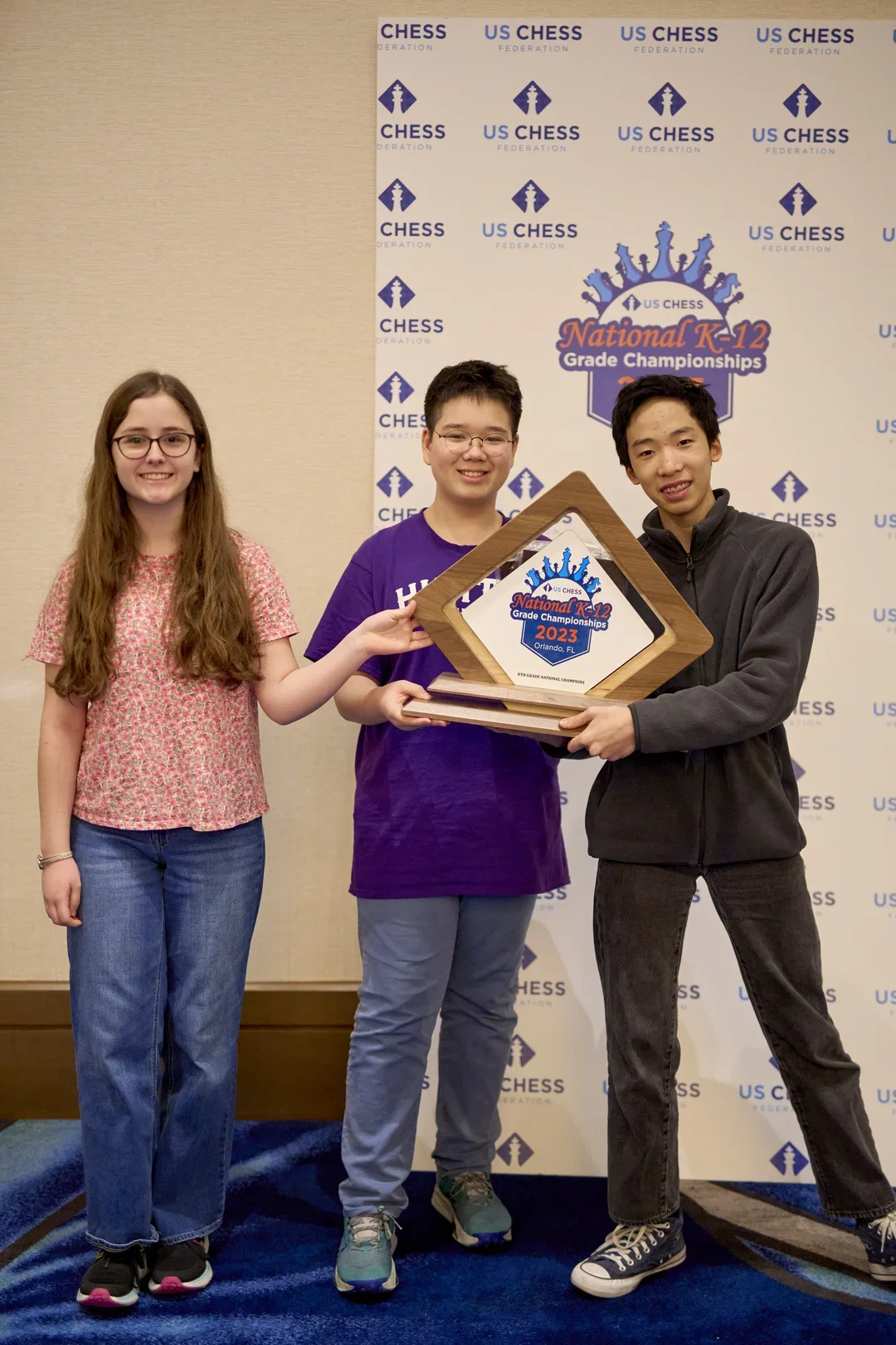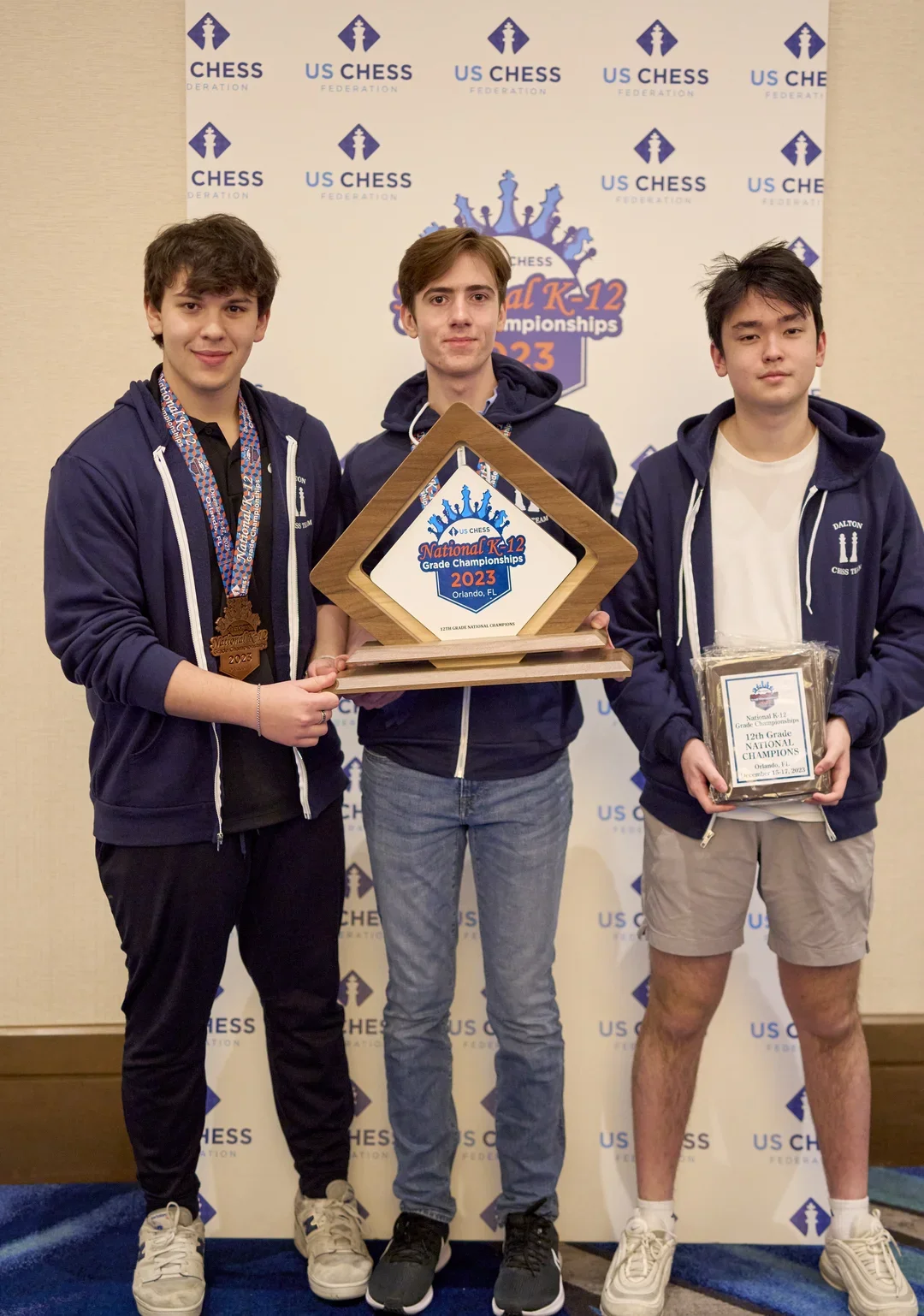 Co-Champions: IM-Elect Brewington Hardaway (L, NY), Aiden Reiss (NY), and FM Erick Zhao (R, PA), 6/7