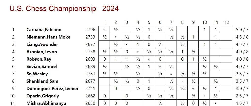 Caruana preserves his half-point lead over GM Awonder Liang headed into the final three rounds. Adjusted for games played, Niemann is in third and GM Sam Sevian (who has played one fewer game than Niemann) is in equally good position to make a move up the leaderboard, especially with Sevian – Niemann looming in the final round.
