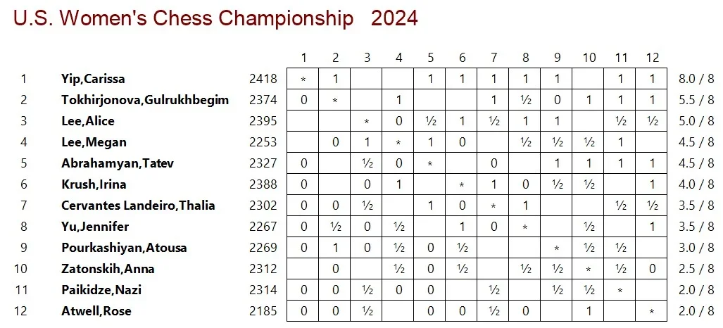 The race for second place is still highly contested, as Lee moved within a half-point of IM Gulrukhbegim Tokhirjonova. With a $30,000 prize for second (and $20,000 for third), there's still a lot to play for even if catching up with the leader is all but impossible at this point!