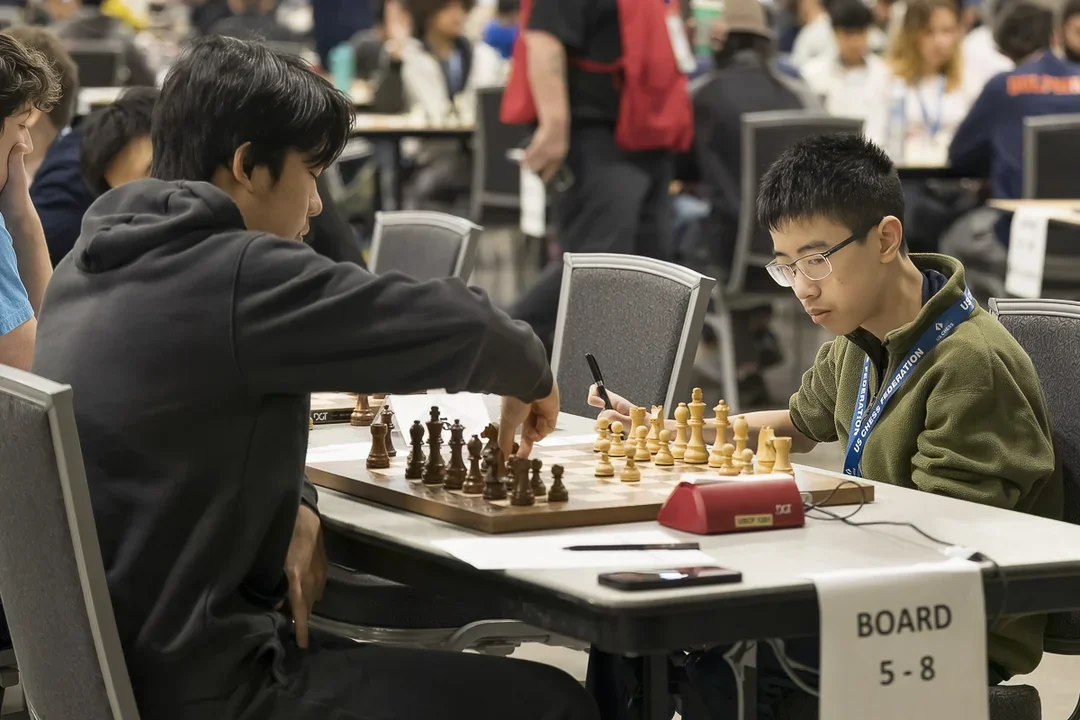 Three players lead the 11th Grade section with 4½/5 scores: IM Erick Zhao (PA), CM Logan Shafer (TX), and FM Vaseegaran Nandhakumar (TX). Zhao and Nandhakumar drew in Round 5 while Shafer put up several impressive attacks: