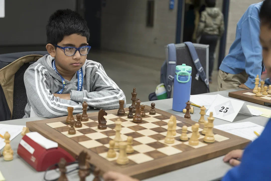 The 3rd Grade section is our first real logjam of the tournament, with seven players leading on 4½/5. The highest-rated player in the section, Brian Ye (CA), is not among them, however, after losing to co-leader Mahith Balamurali (TX) in Round 4: