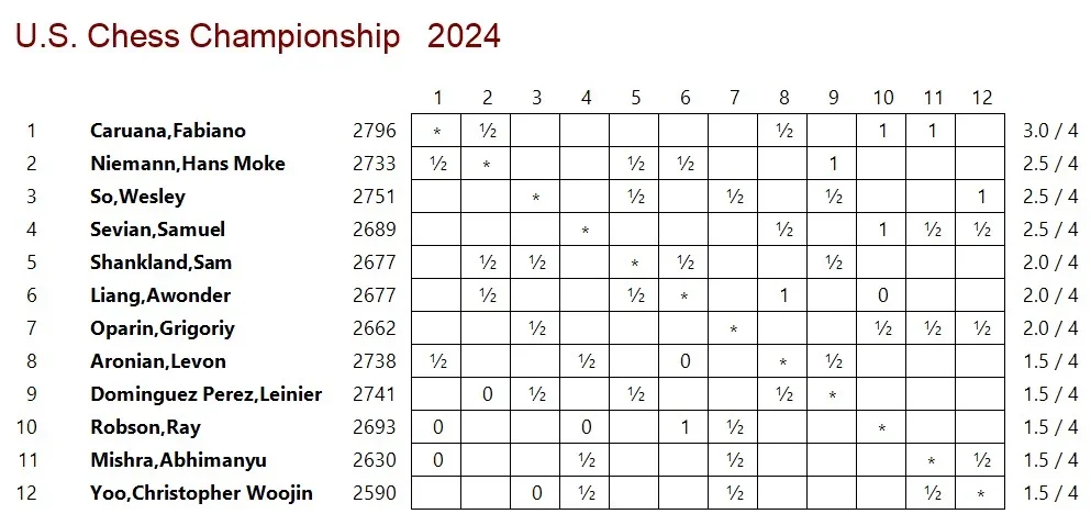 Today is a rest day, which will almost certainly mean even better preparation for round five. Headline pairings: Yoo-Caruana and Niemann-So, where all players involved will be ready for a fight.
