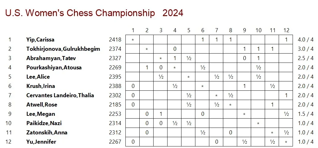 Round four of the 2024 U.S. Championship and U.S. Women’s Championship saw last year’s defending champions GM Fabiano Caruana and IM Carissa Yip each notch another victory, with a total of four more decisive games (across the two sections) to boot. Caruana climbed to the sole lead for the first time, while Yip extended her lead to a full point heading into the first rest day.