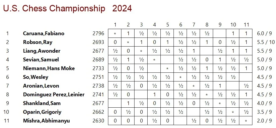 With GM Awonder Liang holding an uneventful draw against GM Wesley So, Caruana’s 6/9 score keeps him a half-point ahead of Liang (who gets his turn against Dominguez today). GM Ray Robson has finished the event with 5½/10.