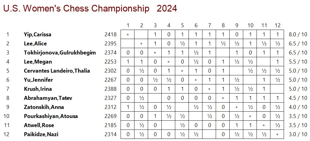 With a round to spare, IM Carissa Yip has won the 2024 U.S. Women’s Championship and the $35,000 first prize (plus a $5,000 winner’s bonus). GM Fabiano Caruana still leads GM Awonder Liang by a half-point in the 2024 U.S. Championship.